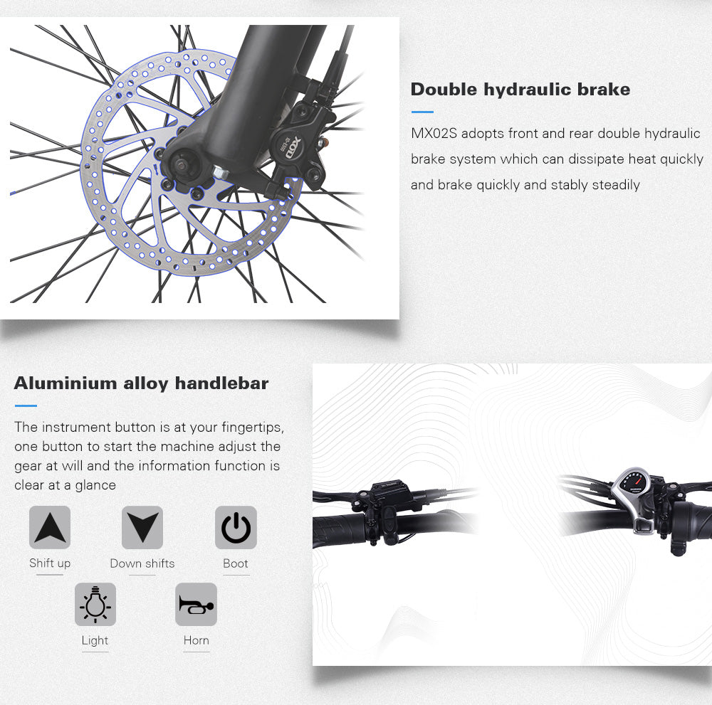 CONFIGURACIÓN: El sistema de transmisión Shimano tiene mejor calidad y es más duradero. El uso del acelerador de pulgar y el cambio de marchas en diferentes carreteras facilitan la conducción y ahorran energía. El freno de disco delantero y trasero es más sensible, lo que puede reducir efectivamente la distancia de frenado. Los faros brillantes aseguran una buena vista por la noche. La bicicleta eléctrica pesa 29 kg y tiene una carga máxima de 150 kg.