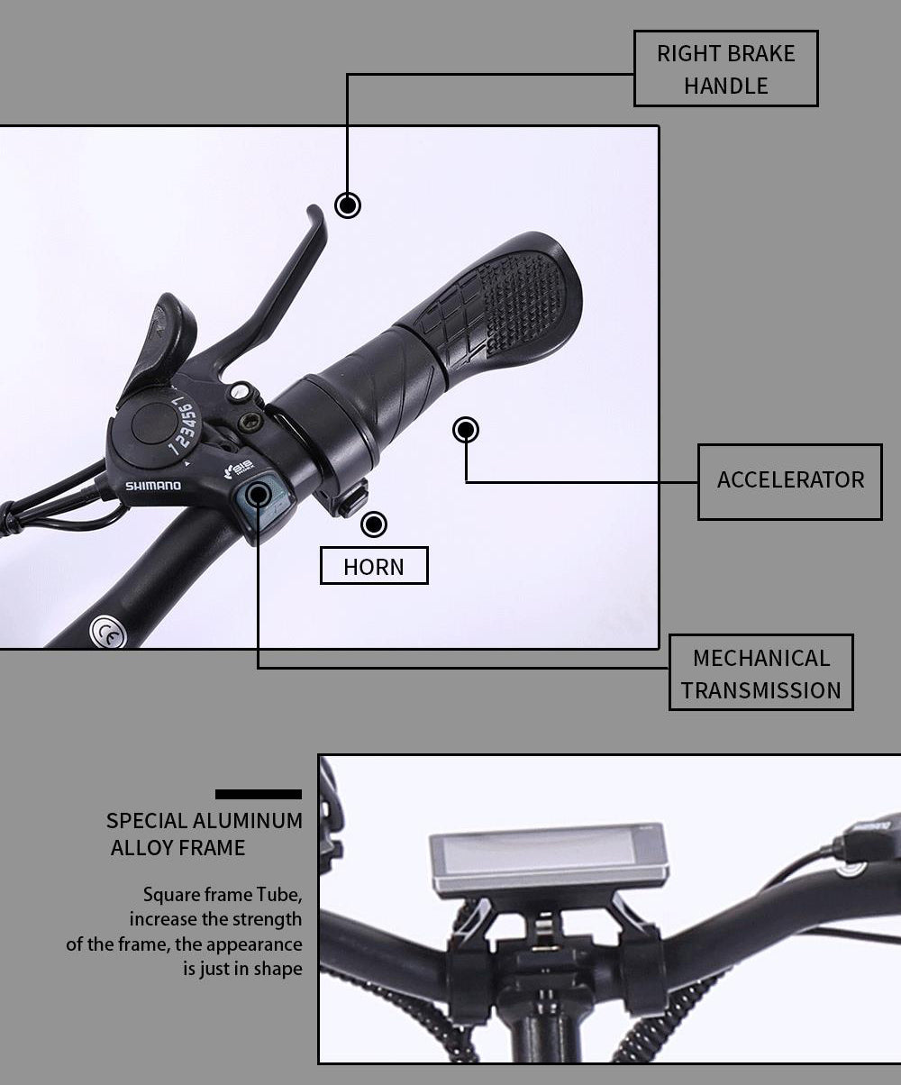 Drei Arbeitsmodi: [Pedal Assist Mode] - Der Motor unterstützt Sie mit kontinuierlicher Kraft beim Treten des Fahrrads. [Vollelektrischer Modus] - Drehen Sie einfach den Gashebel (muss nicht in die Pedale treten). [Manueller Modus] - Treten Sie wie beim normalen Fahrrad auf das Pedal.