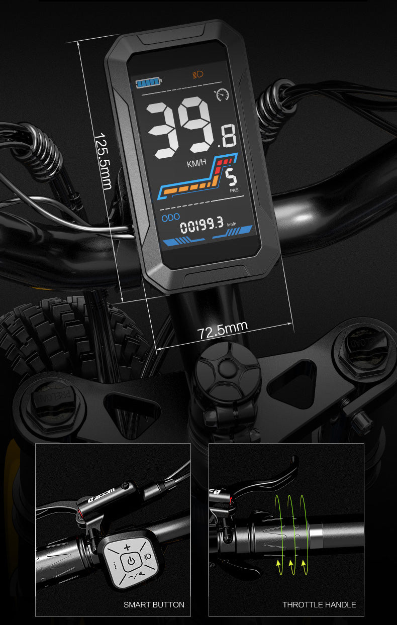 Afișaj multifuncțional: Echipat cu afișaj LCD inteligent, astfel încât să puteți verifica mai convenabil datele de călătorie, cum ar fi viteza, nivelul bateriei, odometrul și așa mai departe, puteți, de asemenea, să comutați nivelul de asistență la pedală în funcție de starea drumului.